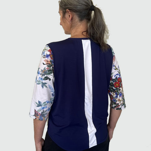 - two colour options with a bright stripe on back of tee, pop of colour/pattern at sleeves