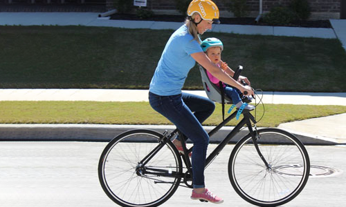 Riding with a Front Kids Bike Seat – best suited to riding on bike paths and easy trail. Can be used in traffic if you are comfortable in the riding environment. There can be some challenges with mounting /dismounting/ stopping and reach to the handlebars with a child positioned in front of you… learn more at Riding Safely with a Front Kids Bike Seat