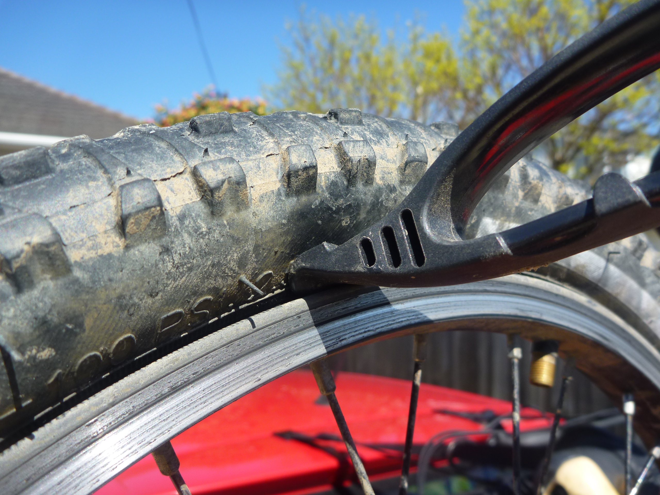 So if you have to use this method go slowly and carefully and good luck. Insert a tyre lever and push it up flicking the tyre over the rim.