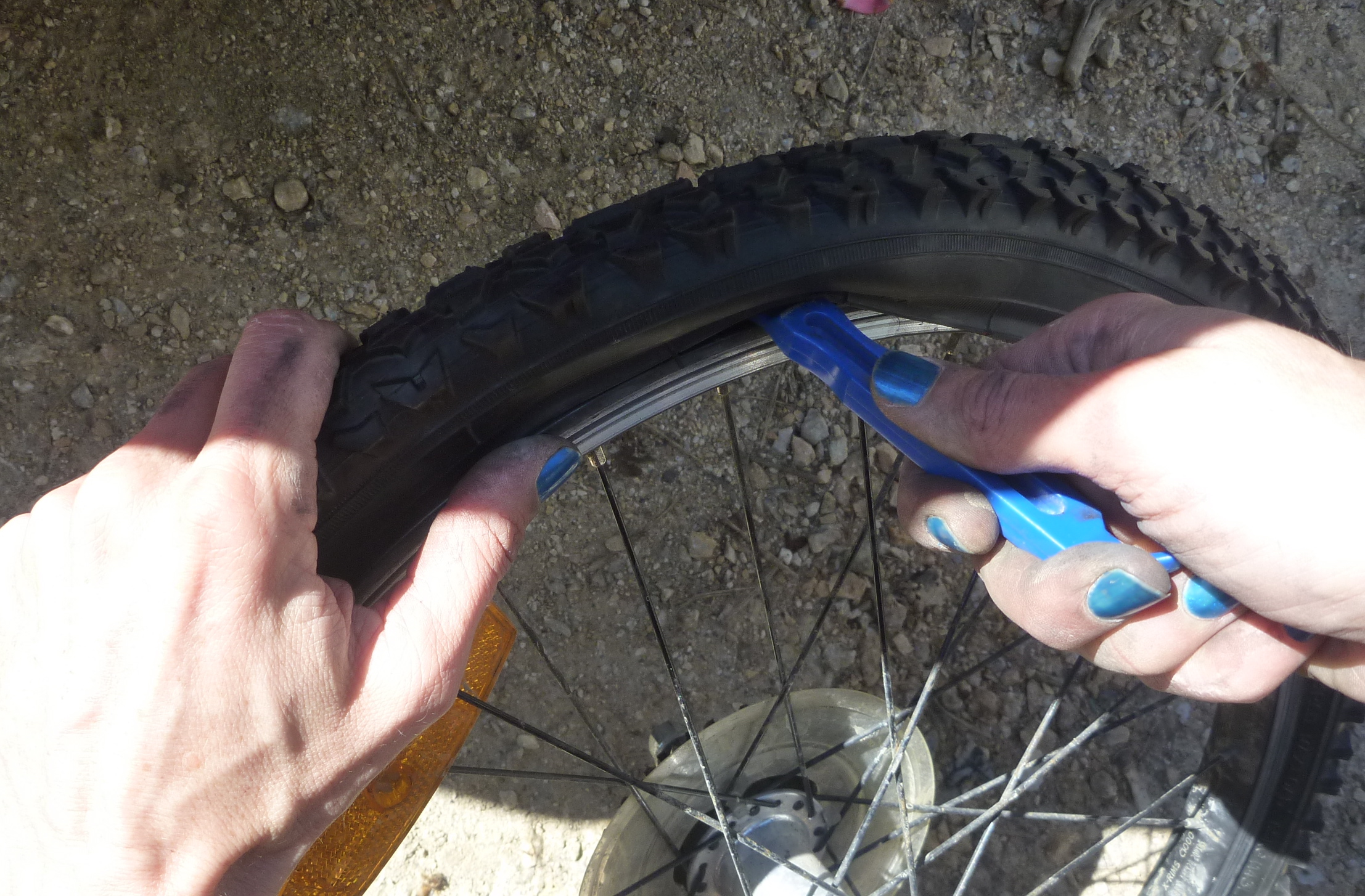Oh so easy to say this, not so easy to do this, again be patient. If this is just not working you can use your bike tyre levers. But this involves a slight risk. When inserting the bike lever it is quite easy to pinch the tube onto the rim of the wheel – meaning you may puncture the tube. Just when you feel really good about getting your tyre back on pumping it up will let you know that you have to take it all off again to fix the pinched tube!