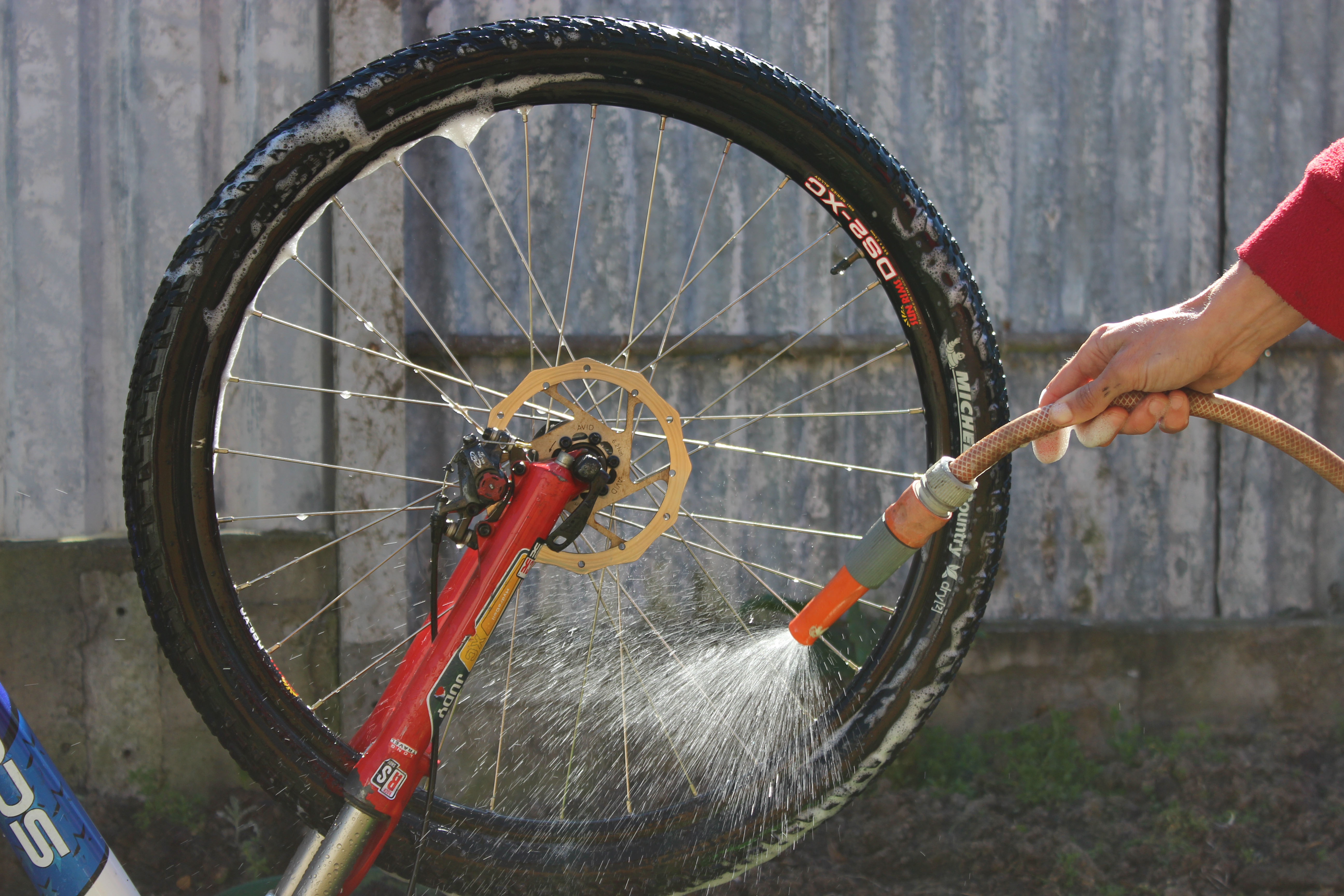 The biggest part of your tyre is the rubber and, depending on the tread, it can carry a lot of dirt. The best thing to clean rubber with is biodegradable bike cleaner or dishwashing liquid – yes – and the more bubbles the better! The kids love this, most adults too.