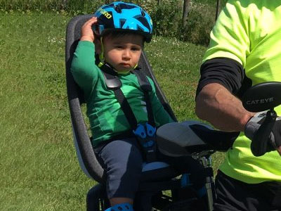 We love this seat. Super lightweight, quick, & easy to attach to a carrier and change between bikes. Suitable for a wide age range – 1-6 year olds.