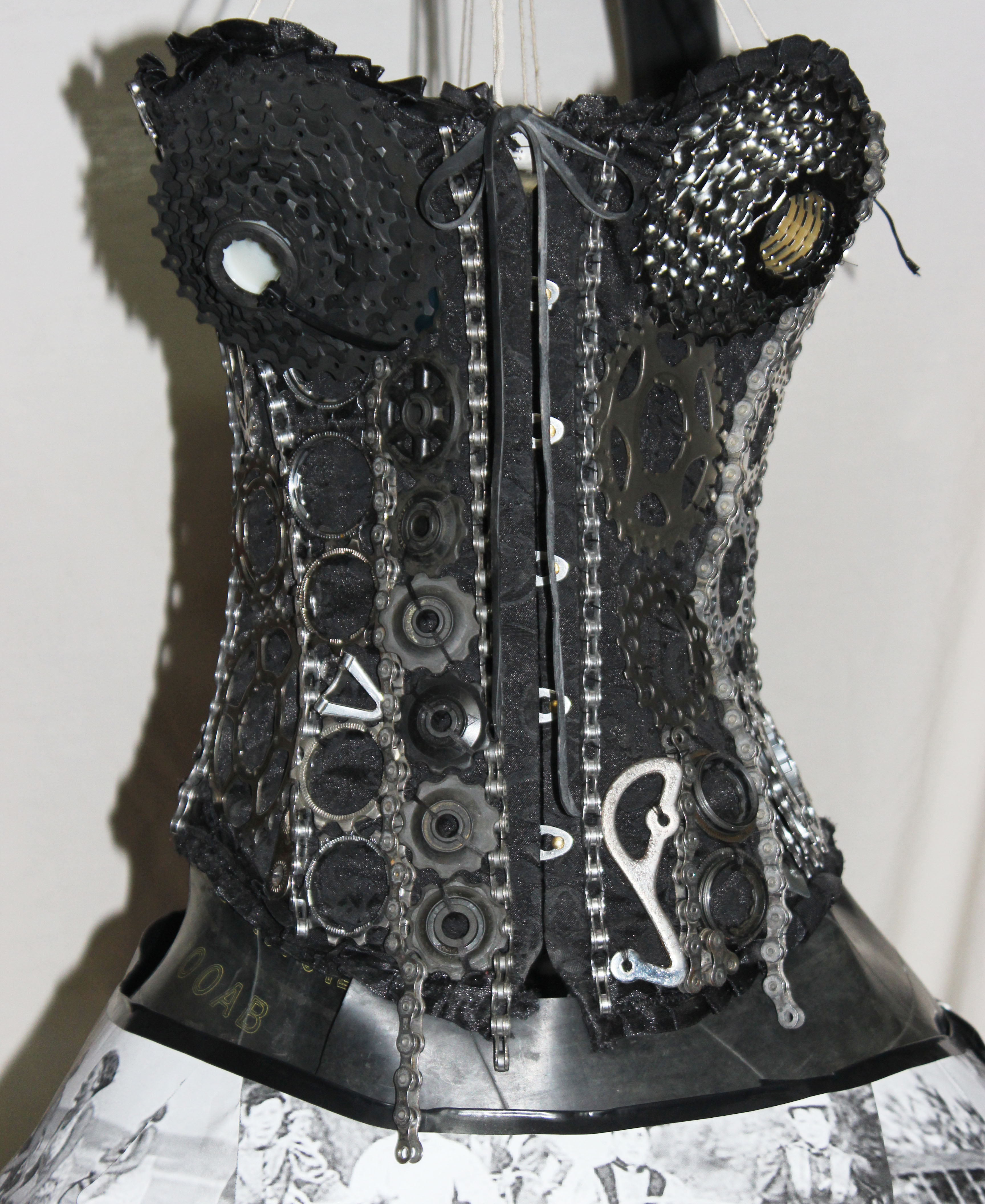 The corset is covered in all sorts of bike bits and pieces like chains, cogs, clusters and stem caps. It is held together at the back with brake cable.