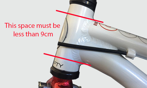 The junction of the bike frame and steering tube must be less than 9cm Your set up at the junction can be one of these three options…depending on frame design of the childs bike.