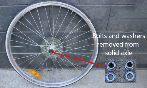 Solid Axle/Bolt On – A nut will come off from each side of your axle. The axle is solid meaning it will not slide out, it will leave the exposed thread of your axle on your bike.