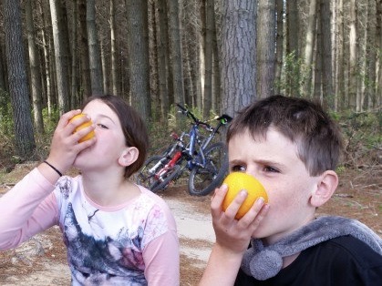 - A picnic lunch under the cover of the trees.  We found a spot off to the side of a track and munched on our lunch.  The kids discovered what great water glasses oranges make…