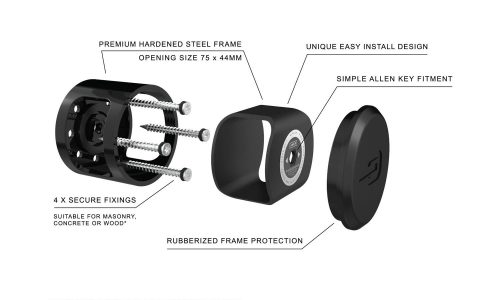 Features; Suitable for outdoor or indoor use. Can be mounted to the wall or ground and designed to be removable/repositioned. Screw to masonry, concrete or wood. Made from premium steel with a toughened nylon outer. Large opening size is 75 x 44mm.