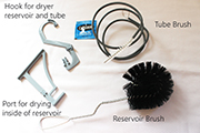 Features: Kit contains tube brush, brush for inside of the bladder (reservoir). Hook for hanging up bladder and tube. Port that goes on the inside of the bladder to allow air to flow and dry the inside of the bladder. Included a couple of cleaning tablets for a thorough clean. This all comes in a cotton storage bag.