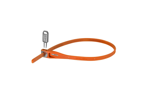 Features; lightweight, easily carried, adjustable zip tie design. Available with keys in a bright Orange or a 3 digit combination mechanism with reset function in bright Yellow. Weighs 80 grams and has a 43cm locking diameter. Reinforced steel core.