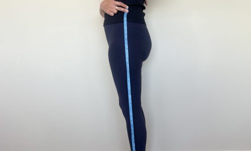 Check this length on your body by placing the start of the tape measure where you image the top of the waistband would sit at the side of your body. Let the tape hang down the length of your body. Find the finished length on the tape measure, noting where this is on your body.
