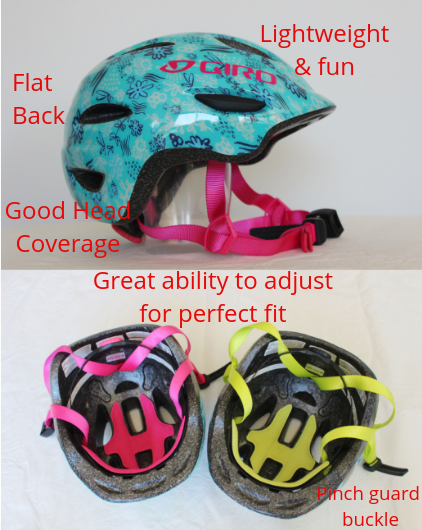 Adjustable – The helmet needs to have adjustable straps and a mechanism at the back of the helmet that turns/slides to help fit to the head or different thickness of pads to insert into the helmet. A chin pinch guard can help avoid that horrible moment when you pinch their skin.