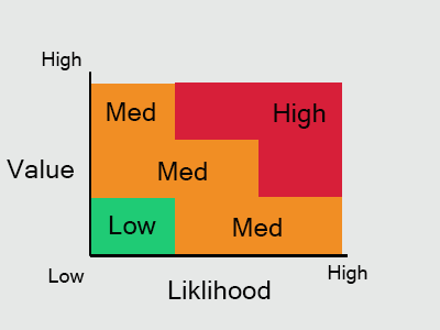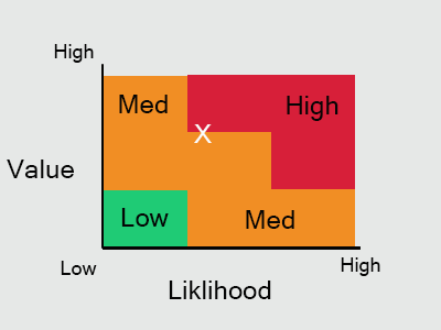 Plot an X where both likelihood and value meet. Is it in a green area (low risk), orange area (medium risk) or a red area (high risk)?