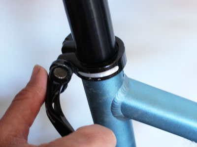 Quick release mechanism – move your quick release to the open position. This will undo the seat post clamp and now the seat post will slide up or down in the tube. Make your adjustment and securely tighten the seat post clamp by closing the quick release mechanism.